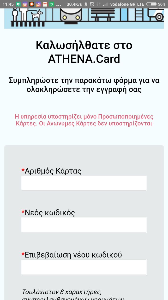 Υπόψιν η εφαρμογή μπορεί να χρησιμοποιηθεί μόνο από κατόχους προσωποποιημένης ATH.ENA Card και όχι ανώνυμης κάρτας ή ATH.ENA Ticket. Επίσης για να μπορέσετε να χρησιμοποιήσετε την εφαρμογή για να μπορείτε έτσι ν’ αγοράσετε online εισιτήρια, απαιτείται εγγραφή κατά την οποία επιλέγετε ένα νέο κωδικό και όχι το PIN που χρησιμοποιήσατε για την έκδοση της κάρτας σας.