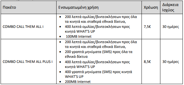 Α) Ανακοινώνεται η από 16/01/2018 εμπορική διάθεση των πακέτων COMBO CALL THEM ALL i για τους συνδρομητές καρτοκινητής τηλεφωνίας WHAT’S UP της COSMOTE. Τα βασικά χαρακτηριστικά και οι χρεώσεις των νέων πακέτων συνοψίζονται στον ακόλουθο πίνακα: