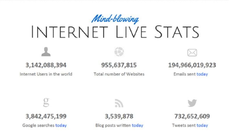 Στην ιστοσελίδα αυτή, έχουμε τη δυνατότητα να μάθουμε πόσοι άνθρωποι χρησιμοποιούν το διαδίκτυο σε πραγματικό χρόνο και όχι μόνο. Τα νούμερα μας δείχνουν ιστοσελίδες που δημιουργήθηκαν, τα email που στέλνονται σήμερα, τα blogpost, τα tweets, τις φωτογραφίες που ανεβαίνουν στο Instagram, τους ενεργούς χρήστες στο Facebook, στο Twitter, στο Pinterest, τα Skype calls και πολλά άλλα ενδιαφέροντα δεδομένα. Παράλληλα, στη σελίδα θα βρούμε πληροφορίες για τα κινητά που πουλήθηκαν σήμερα, πόσα GB δεδομένων μεταφέρθηκαν από τους χρήστες αλλά και τί εκπομπές ρύπων υπήρξαν εξαιτίας των παραπάνω δραστηριοτήτων!