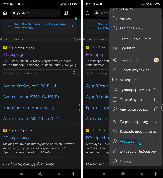 Έτσι, αφού κατεβάσουμε και εγκαταστήσουμε τον Kiwi browser, απλά πηγαίνουμε στις ρυθμίσεις του πατώντας στις τρεις τελείες πάνω δεξιά…