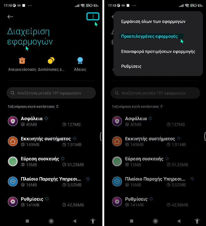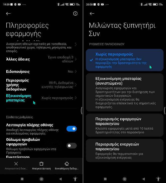 Στα κινητά της Xiaomi, η σχετική ρύθμιση βρίσκεται στην ενότητα “Εφαρμογές > Διαχείριση εφαρμογών”, και στις δύο ενδείξεις που παρατηρούμε στην κάτωθι εικόνα.