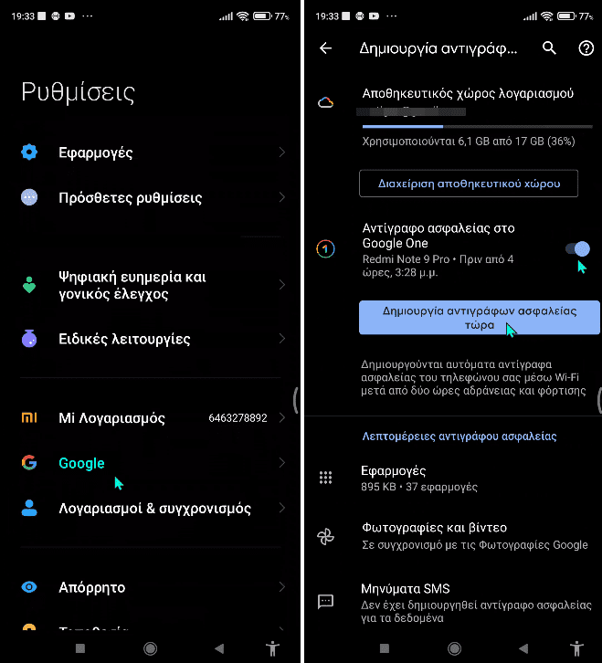Για να αξιοποιήσουμε αυτή την εξαιρετική λειτουργία, ανοίγουμε τις Ρυθμίσεις> Google > Δημιουργία αντιγράφων ασφαλείας και βεβαιωνόμαστε ότι είναι ενεργή η επιλογή Δημιουργία αντιγράφων ασφαλείας από το Google One. Στη συνέχεια, πατάμε στη Δημιουργία αντιγράφων ασφαλείας.
