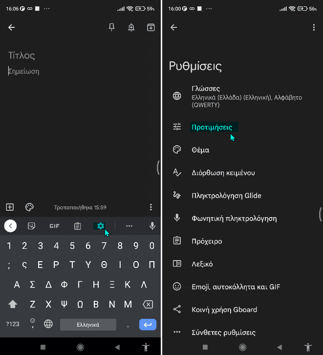 Απλά ανοίγουμε το Gboard, πατάμε στις Ρυθμίσεις και μετά στις Προτιμήσεις.