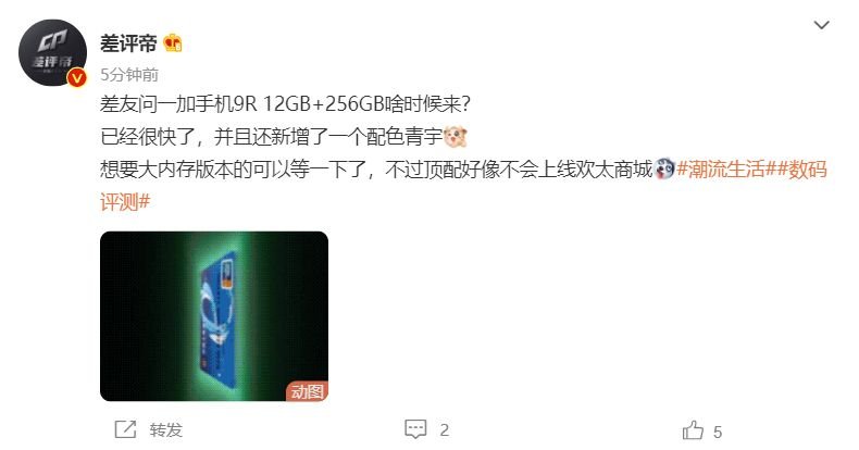 Σήμερα, ο ψηφιακός blogger @ 差 评 帝 διέρρευσε την είδηση ότι η έκδοση 12 + 256 GB του OnePlus 9R θα έρθει σύντομα και ότι θα προστεθεί ταυτόχρονα ένα νέο συνδυασμό χρωμάτων Qingyu.