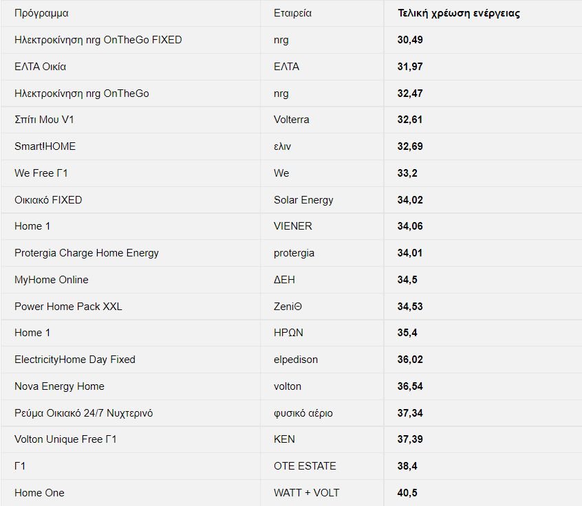 Το ΒusinessDaily έκανε μία ενδεικτική σύγκριση τιμών μόνο με τις βασικές επιλογές του εργαλείου σύγκρισης και με βάση κατανάλωση που αντιστοιχεί στον εθνικό μέσο όρο, ώστε να υπάρξει μια ενδεικτική κατάταξη των παρόχων και των προϊόντων τους, η οποία φαίνεται στον ακόλουθα πίνακα.
