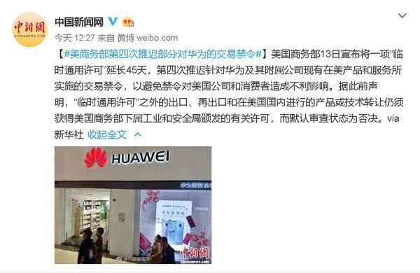 Σύμφωνα με το Xinhua.com, το Υπουργείο Εμπορίου των ΗΠΑ ανακοίνωσε στις 13 Φεβρουαρίου ότι θα παρατείνει την “προσωρινή γενική άδεια” για 45 ημέρες και για τέταρτη φορά ανέβαλε την απαγόρευση συναλλαγών στην Huawei και στα υπάρχοντα αμερικανικά προϊόντα και υπηρεσίες των θυγατρικών της.