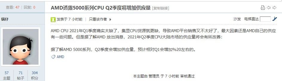 Σύμφωνα με τον Bobantang, παρόλο που οι επεξεργαστές AMD και οι κάρτες γραφικών δεν είναι διαθέσιμος φέτος, η AMD κυκλοφόρησε εσωτερικά ένα ενημερωτικό δελτίο, ότι προτίθεται ν’ αυξήσει την προμήθεια επεξεργαστών της σειράς Ryzen 5000 το δεύτερο τρίμηνο κατά περίπου 20% σε σχέση με το Q1.