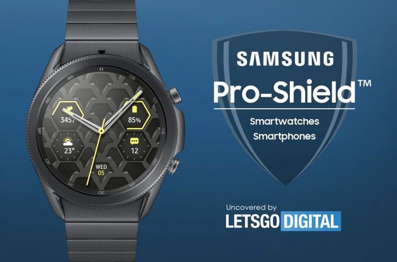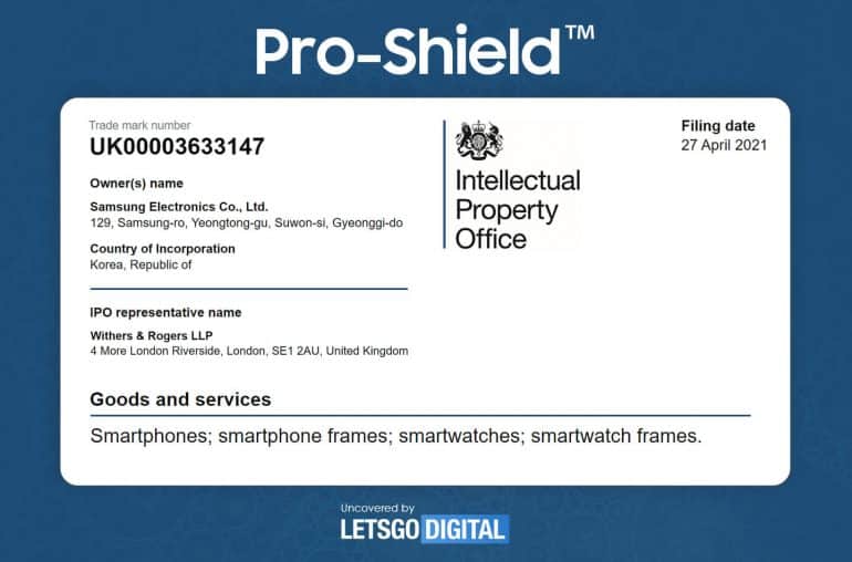 Στις 27 Απριλίου 2021, η Samsung Electronics υπέβαλε αίτηση στο Γραφείο Διανοητικής Ιδιοκτησίας του Ηνωμένου Βασιλείου (UK IPO) για το όνομα «Pro-Shield». Το εμπορικό σήμα κατηγοριοποιείται ως κλάση 9, με την περιγραφή: «smartphones; πλαίσια smartphone έξυπνα ρολόγια; πλαίσια smartwatch ».