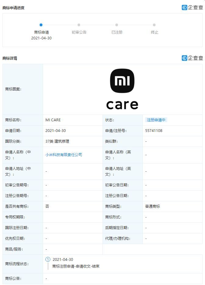 Η εφαρμογή Enterprise Check δείχνει ότι πρόσφατα, η Xiaomi Technology Co., Ltd. έχει προσθέσει μια σειρά πληροφοριών εφαρμογής εμπορικών σημάτων για “MI CARE” και “CARE MI”.