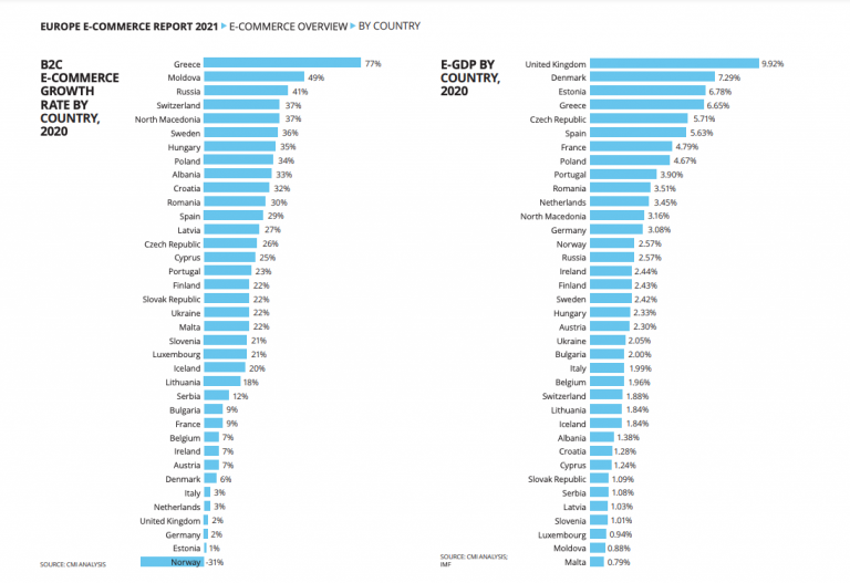 Οι ηγέτες στον κύκλο εργασιών ηλεκτρονικού εμπορίου B2C παραμένουν το Ηνωμένο Βασίλειο (236 δισεκατομμύρια ευρώ), η Γαλλία (112 δισεκατομμύρια ευρώ), η Γερμανία (93,6 δισεκατομμύρια ευρώ) και η Ισπανία (68,4 δισεκατομμύρια ευρώ). Ωστόσο, οι υψηλότεροι ρυθμοί ανάπτυξης στον κύκλο εργασιών ηλεκτρονικού εμπορίου εντοπίστηκαν στην Ελλάδα (77%), τη Μολδαβία (49%), τη Ρωσία (41%), την Ελβετία, τη Βόρεια Μακεδονία (37%), και τη Σουηδία (36%).