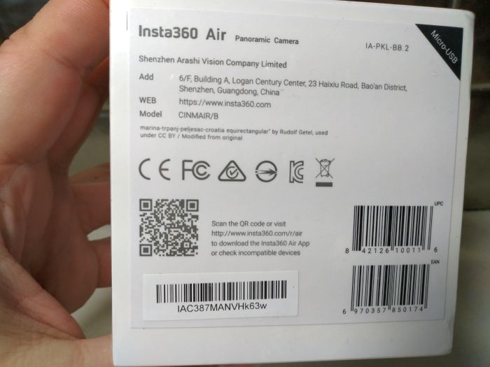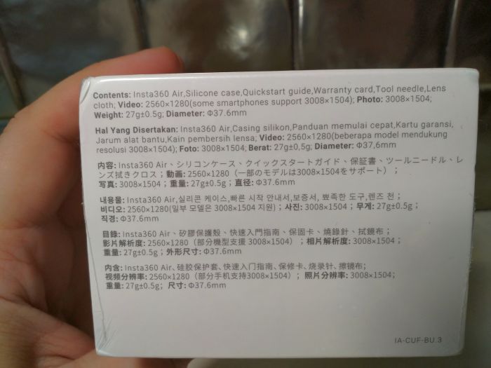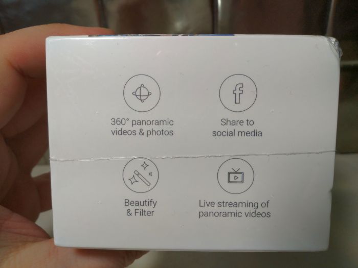 Το κινητό που βλέπετε στην εικόνες είναι το Xiaomi Redmi Note 4, οπότε βλέπετε πόσο μικρό είναι το κουτάκι. Συγκεκριμένα οι διαστάσεις του είναι 10.20 x 10.20 x 9.30 cm. Όπως βλέπετε και από τις φωτογραφίες από την μία μεριά έχει φωτογραφία της Insta360 κάμερας, ενώ από την άλλη έχει τον QR κωδικό που πρέπει να σαρώσετε ώστε να κατεβάσετε την εφαρμογή που έρχεται μαζί με την κάμερα, για να δουλέψει με το κινητό σας. Θα βρείτε όμως και άλλες χρήσιμες πληροφορίες στις άλλες πλευρές του κουτιού εάν το γυρίσετε….