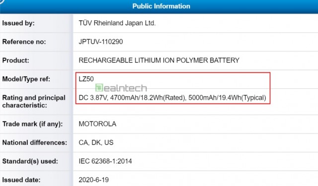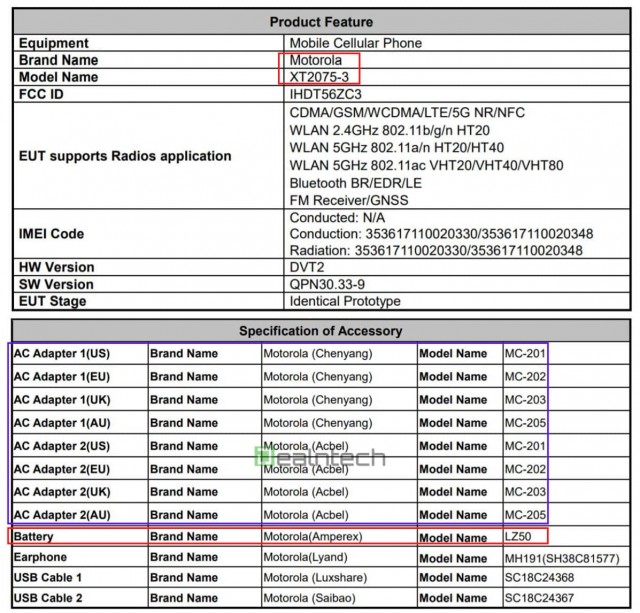 Η λίστα FCC δηλώνει ότι το τηλέφωνο XT2075-3 υποστηρίζει Wi-Fi 5G, NFC, dual-band, GPS, GLONASS και Galileo. Η λίστα TUV Rheinland αποκαλύπτει ότι το τηλέφωνο είναι με μπαταρία 5.000 mAh με ονομαστική χωρητικότητα 4.700 mAh. Το κινητό θα έρχεται με υποστήριξη για γρήγορη φόρτιση 20W.