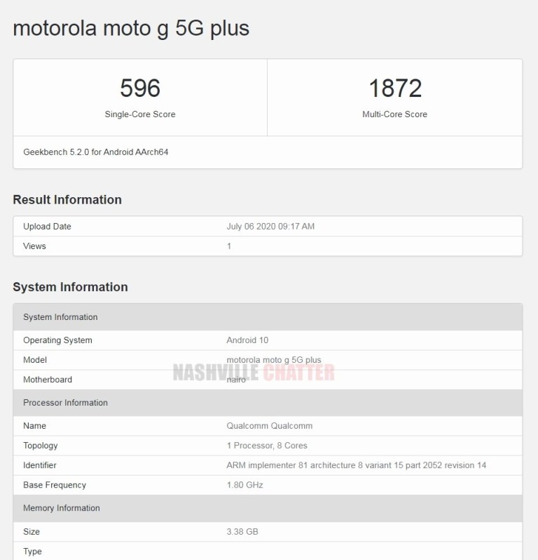 Το Moto G 5G Plus εμφανίστηκε στην πλατφόρμα συγκριτικής αξιολόγησης Geekbench με έναν επεξεργαστή οκταπυρήνο από την Qualcomm που έχει βασική συχνότητα 1,8GHz. Το κείμενο που αναφέρεται στο πεδίο αναγνώρισης υποδηλώνει ότι θα μπορούσε να περιλαμβάνει τον Snapdragon 765G SoC. Η λίστα Geekbench 5 αποκαλύπτει περαιτέρω ότι έχει 4 GB μνήμης RAM και λειτουργεί σε Android 10 OS. Στη δοκιμή ενός πυρήνα του Geekbench 5, το κινητό κατέγραψε βαθμολογία 596 και 1872 στη δοκιμή πολλαπλών πυρήνων.