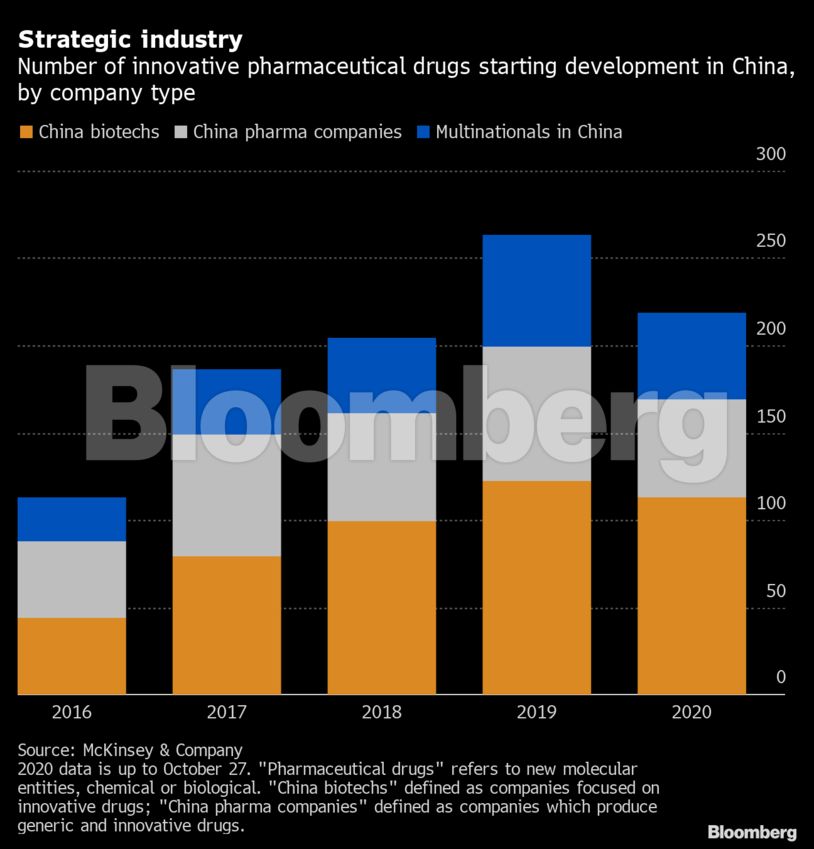 Μια από τις τεχνολογίες στις οποίες θέλει να επιτύχει είναι η βιοτεχνολογία, η οποία ήταν σχεδόν ανύπαρκτη στη χώρα πριν από μια δεκαετία. Μεταξύ του 2016 και του 2020, η κεφαλαιοποίηση των εισηγμένων κινεζικών εταιρειών που εξέλισσαν νέα φάρμακα αυξήθηκε από το $1 δισ., σε $217 δισ.