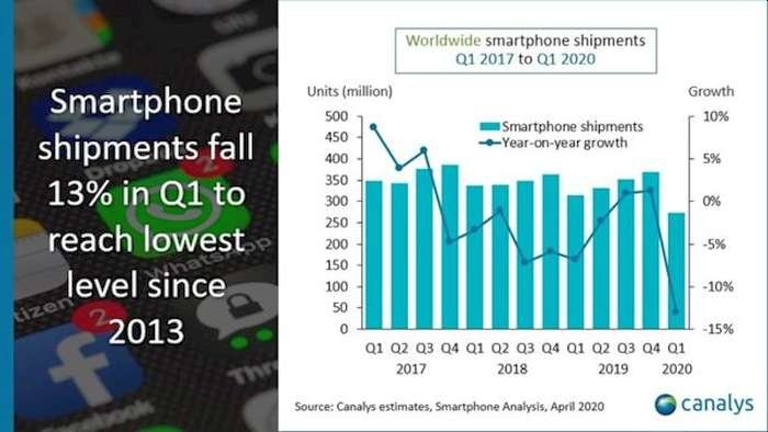 Η Canalys σημείωσε την παγκόσμια πτώση του πρώτου τριμήνου στο 13% από πέρυσι, ενώ η Strategy Analytics είδε τους αριθμούς να πέφτουν κατά 17%. Σύμφωνα με τον Neil Mawston, Εκτελεστικό Διευθυντή της Strategy Analytics, «το παγκόσμιο μερίδιο αγοράς της Samsung διατηρείται σταθερό σε πάνω από 21 τοις εκατό και παραμένει η κορυφαία μάρκα smartphone στον κόσμο». Αυτό συνεχίζει να ακολουθείται από την Huawei και την Apple, καθώς όλοι οι μεγάλοι κατασκευαστές συμμετείχαν σε μια επιτυχία στις πωλήσεις τους. Οι εταιρείες που παρέμειναν σταθερές ή εμφάνισαν ανάπτυξη σύμφωνα με τους αναλυτές περιλάμβαναν τη Xiaomi και τη Vivo, λόγω των ισχυρών πωλήσεων στην Ινδία όπου ξεκίνησαν ορισμένα προϊόντα πριν από την έναρξη των εγκλεισμών.