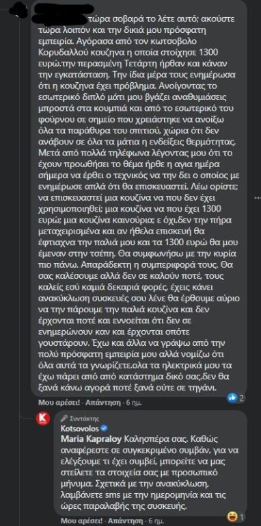 Μια άλλη πελάτισσα απατώντας στα παραπάνω σχόλια παρέθεσε τη δική της αντίστοιχη εμπειρία με την αγορά ελαττωματικής κουζίνας κόστους 1300 ευρώ: