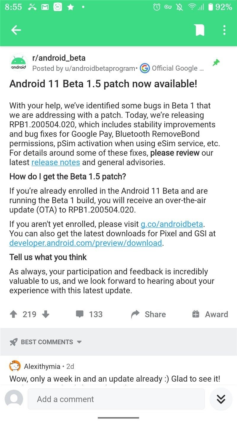 Σύμφωνα με τις αναφορές του 9to5Google, μετά την πρώτη κυκλοφορία του Android 11 Beta την περασμένη εβδομάδα, η Google κυκλοφόρησε σχεδόν αμέσως μετά μία ενημερωμένη έκδοση κώδικα Android 11 Beta 1.5. Η μικρή ενημέρωση αυτής της ώθησης, λύνει το πρόβλημα της διακοπής λειτουργίας της συσκευής και της έλλειψης του Google Pay.