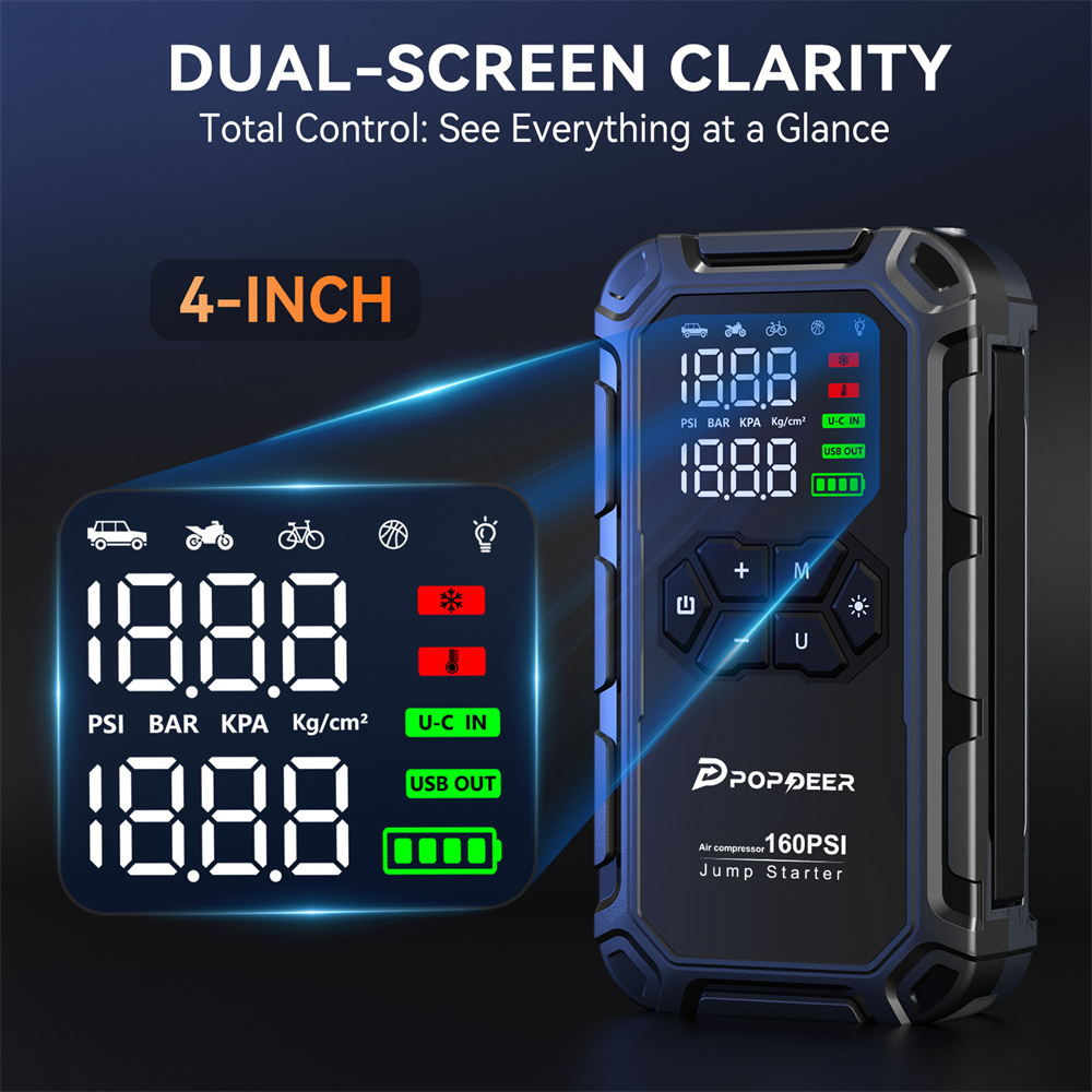 【DUAL-SCREEN CLARITY】The car jumper starter features a 4-inch large LCD (battery level, inflation mode, real-time pressure) and 10-layer protection (overcharge/short-circuit/extreme temps), which ensures the operational clarity and safety in critical scenarios