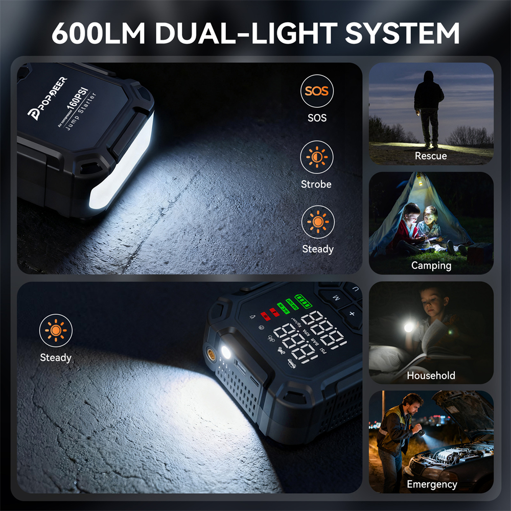 【600LM EMERGENCY LIGHTING】Built-in headlight (steady, strobe, SOS) and small light (steady) , the compact battery jump starter delivers multiful lighting for roadside repairs, camping, or signaling in challenging environments