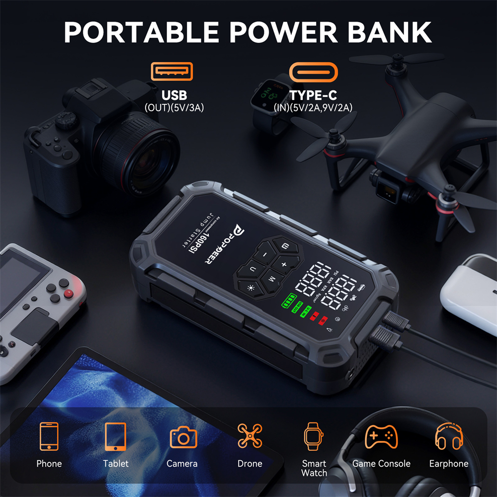 【A BACKUP POWER BANK】This portable jump starter features type-C fast-charging (full charge in 1.5 hours) and USB output for phones, tablets, drones, which makes it an ideal partner for emergency device charging during power outages