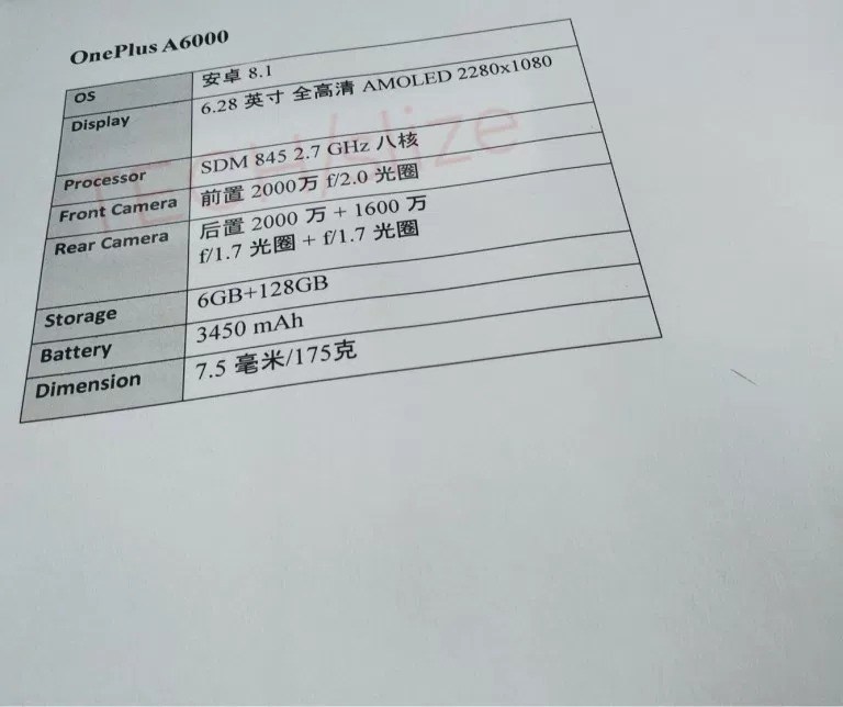 Σύμφωνα με τα όσα βλέπουμε και στην εικόνα, το OnePlus 6 θα έχει FHD+ οθόνη των 6.28 ιντσών και ανάλυση 2280 x 1080 pixels. Η συσκευή θα διαθέτει αισθητήρα δαχτυλικών αποτυπωμάτων στην πίσω πλευρά κλασικά, ενώ θα είναι εφοδιασμένη φυσικά με τον Snapdragon 845. Το κινητό θα έχει 6GB RAM + 128GB αποθηκευτικού χώρου. Όσο για την κάμερα, θα έχει διπλή πίσω κύρια κάμερα με αισθητήρες 16MP+20MP και LED φλας, ενώ η μπροστινή του θα είναι ανάλυσης 20MP.