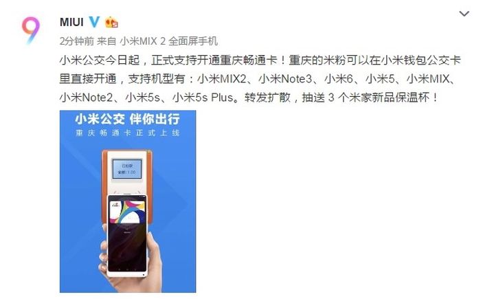 Δυστυχώς το μήνυμα αυτό είναι μόνο για όσους μένουν στην Κίνα. Με την τελευταία έκδοση της ROM, τα Mi Mix 2, Mi Note 3, Mi6, Mi5, Mi Mix, Mi Note 2, Mi 5S και Mi5S Plus που διαθέτουν την λειτουργία NFC, θα μπορούν πλέον να την χρησιμοποιούν οι κάτοχοι των κινητών αυτών και να πληρώνουν στα ειδικά μηχανήματα, το αντίτιμο του εισιτηρίου τους. Η λειτουργία αυτή ουσιαστικά είναι για την κάρτα Guangxi Traffic Card.