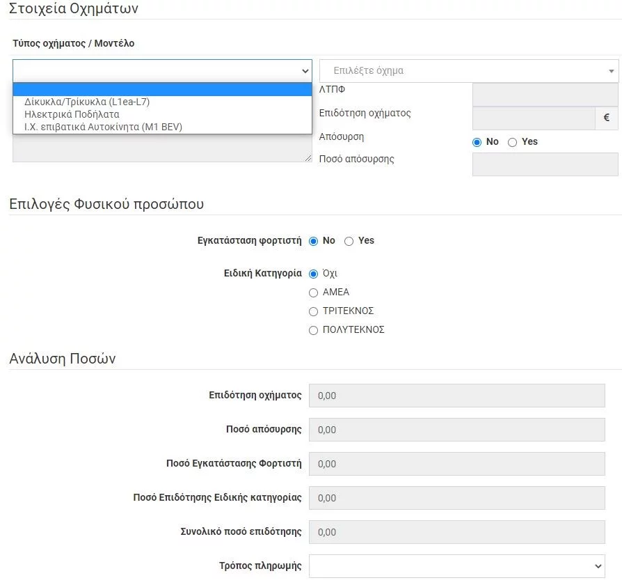 Στη συνέχεια, δηλώνονται οι επιλογές φορτιστή και ειδικής κατηγορίας και υπολογίζονται αυτόματα τα επί μέρους ποσά επιδότησης, καθώς και το συνολικό.