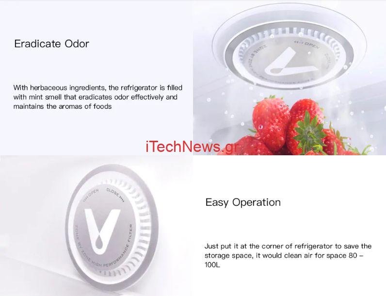 Το συγκεκριμένο προϊόν δεν είναι τίποτα άλλο από ένα ενεργό φίλτρο από βότανα με ιδιότητα παρακράτησης οσμών και εξόντωσης των βακτηρίων που δημιουργούνται στο ψυγείο μας. Το φίλτρο όπως υποστηρίζει η VIOMI (sub brand της Xiaomi σε ότι έχει να κάνει με προϊόντα υγείας) μπορεί να αποστειρώσει έναν χώρο 80 με 100lt μέχρι και 99,99% , έχει διάρκεια 12 μήνες και αφήνει μια ευχάριστη μυρωδιά μέντας.