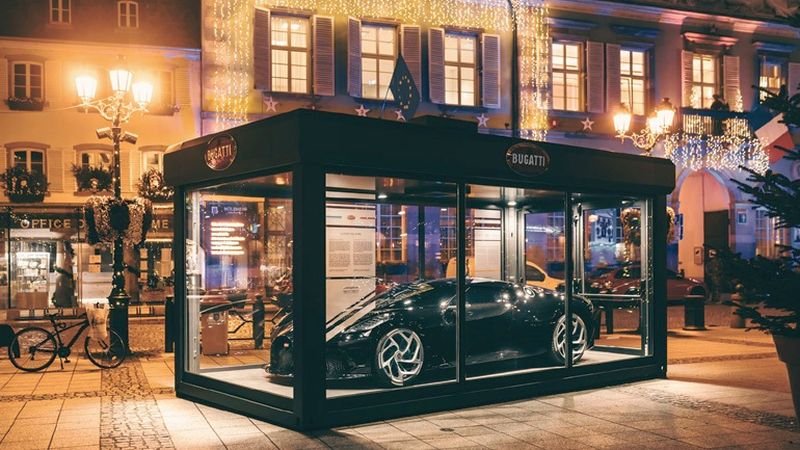 Το γυάλινο box με την Bugatti θα παραμείνει στην κεντρική πλατεία μέχρι τον Μάρτιο του 2021.