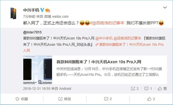 Ο Lu Qianhao, Διευθυντής του Τμήματος Εμπειρίας Καταναλωτών της ZTE, δήλωσε ότι “δεν είμαστε καλοί στο PPT”. Ο επίσημος λογαριασμός της ΖΤΕ στο Weibo αναφέρει ότι όλοι είναι σε απευθείας σύνδεση. Αυτό σημαίνει ότι απέχει πολύ ακόμα από το να προστεθεί στην επίσημη λίστα!? Μάλλον το AXON 10s Pro αναμένεται ότι θα κυκλοφορήσει σύντομα.