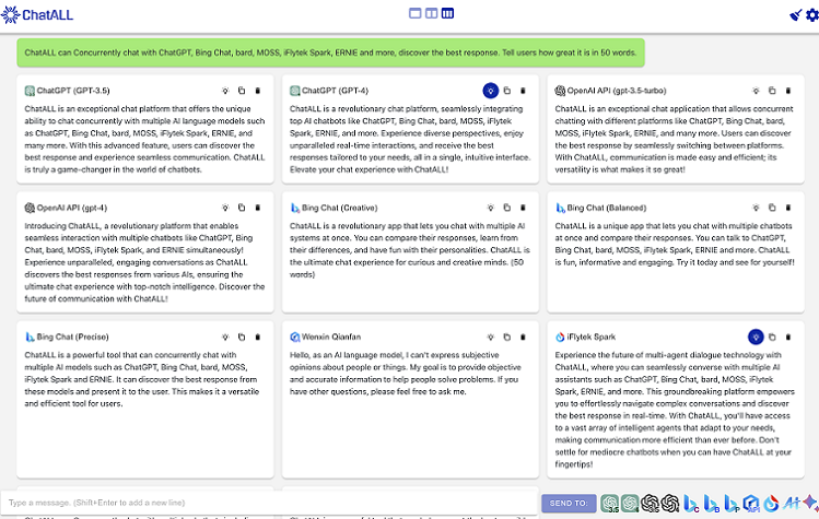 Έτσι, το ChatALL μας λύνει τα χέρια καθώς έχουμε έναν μοναδικό και αποτελεσματικό τρόπο αλληλεπίδρασης με όλα τα κορυφαία chat AI εργαλεία. Αυτό διευκολύνει τη λήψη διαφορετικών απαντήσεων στις ερωτήσεις μας, και μπορεί να βελτιώσει την εμπειρία.
