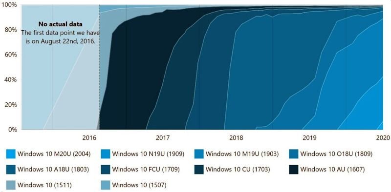 Αναφέρεται ότι η συλλογή δεδομένων βασίζεται σε περισσότερες από 5.000 εφαρμογές του Microsoft Store που χρησιμοποιούν AdDuplex SDK v.2 ή μεταγενέστερη έκδοση και ο χρόνος συλλογής δεδομένων είναι στις 29 Ιουνίου. Ταυτόχρονα, τα δεδομένα δείχνουν ότι η έκδοση 1903 εξακολουθεί να είναι η πιο χρησιμοποιημένη έκδοση των χρηστών Win 10 προς το παρόν, αντιπροσωπεύοντας ουσιαστικά το 46,2%. Η έκδοση του 1909 αντιπροσωπεύει το 35,7%, αλλά ο αριθμός των χρηστών έχει μειωθεί σε σύγκριση με τον προηγούμενο μήνα.