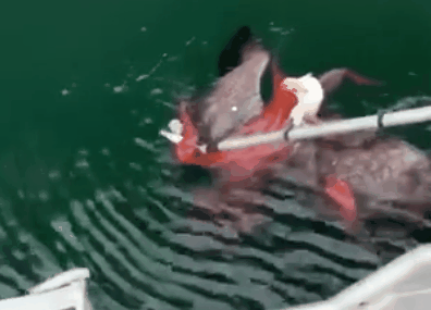 Στο βίντεο, οι ψαράδες χρησιμοποιούν μια μακριά ράβδο για να ξεφορτωθούν τα πλοκάμια στο φαλακρό αετό, και έπειτα ο φαλακρός αετός πετάει από το νερό.
