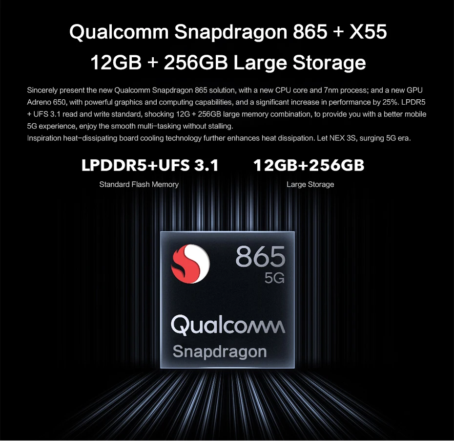 Όσον αφορά τη διαμόρφωση του πυρήνα, ο vivo NEX 3S χρησιμοποιεί μια οθόνη 6,99 ιντσών με ανάλυση 2256 × 1080 και αναλογία οθόνης προς σώμα 99,6% (η μόνη ναυαρχίδα Snapdragon 865 με τόσο υψηλή αναλογία). Είναι εξοπλισμένο με Qualcomm Snapdragon 865, μέγιστο εφοδιασμένο με 12GB LPDDR5 RAM και 256GB μνήμη flash UFS 3.1. Μπροστά η κάμερα είναι με φακό 16MP, ενώ πίσω έχει 64MP κύρια κάμερα + 13MP ευρυγώνιος μακρο-κάμερα + 13MP τηλεφακό κάμερα. Η μπαταρία που έχει είναι χωρητικότητας 4500mAh και υποστηρίζει 44W φόρτιση φλας. Ταυτόχρονα το κινητό υποστηρίζει NFC, WiFi 6 και NSA διπλής λειτουργίας 5G.
