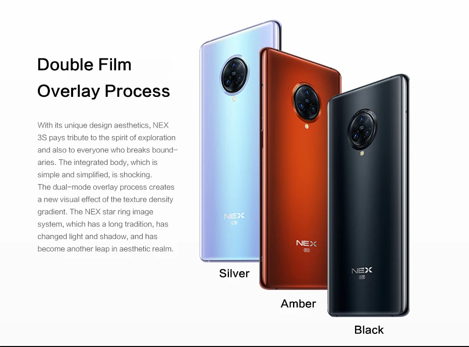 Όσον αφορά την εμφάνιση, το νίνο NEX 3S 5G φέρνει ένα νέο χρώμα που ταιριάζει με το succinol. Ο διευθυντής προϊόντων Vivo, Ding Guanli, εισήγαγε ότι ο νέος σχεδιασμός του κεχριμπαρένιου χρώματος του vivo NEX 3S είναι εμπνευσμένος από το πορτοκαλί. Έχει λαμπερή και μεταβαλλόμενη λάμψη ως βιολογικό στολίδι. Ο σχεδιαστής χρησιμοποιεί μια εκλεπτυσμένη μέθοδο σχεδιασμού για να το παρουσιάσει στο σώμα στο μέγιστο βαθμό.