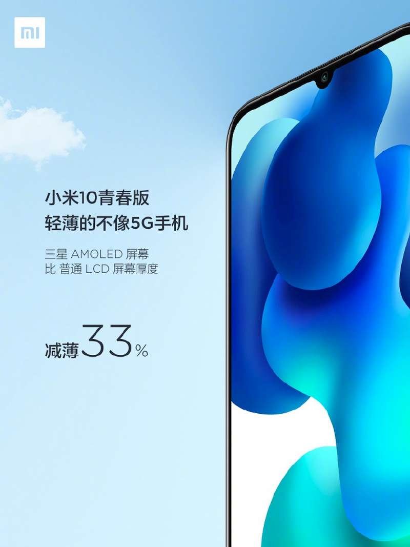Το Mi 10 Youth Edition χρησιμοποιεί ουσιαστικά μια λεπτότερη οθόνη Samsung AMOLED, η οποία είναι 33% πιο λεπτή από τις συνηθισμένες οθόνες LCD, βοηθώντας τον ήδη στενό χώρο του κινητού τηλεφώνου να γίνει μικρότερος. Η οθόνη AMOLED έχει προφανή πλεονεκτήματα όσον αφορά την κατανάλωση ενέργειας και μπορεί να εγγυηθεί μεγαλύτερη διάρκεια ζωής της μπαταρίας υπό την ίδια κατάσταση ισχύος. Επιπλέον, από την αφίσα φαίνεται ότι το Mi 10 Youth Edition χρησιμοποιεί ένα σταγονοειδές notch.