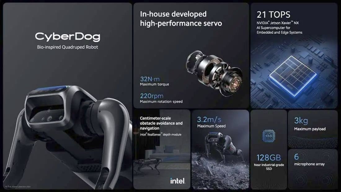 Επιπλέον, η Xiaomi σημειώνει ότι η ίδια έχει αναπτύξει σερβοκινητήρες για το CyberDog, με μέγιστη ταχύτητα περιστροφής 220 σ.α.λ. και ροπή 32 Nm. Το ρομπότ μπορεί να κινείται με ταχύτητες έως 3,2 μέτρα ανά δευτερόλεπτο (περίπου 11,5 χλμ./Ώρα) και να μεταφέρει φορτία βάρους έως 3 κιλά. Η εταιρεία έχει εξοπλίσει επίσης το ρομπότ με τρεις υποδοχές USB Type-C και έναν HDMI, επιτρέποντας στους προγραμματιστές και τους λάτρεις να αναβαθμίσουν το CyberDog όπως κρίνουν σκόπιμο, προσθέτοντας, για παράδειγμα, οπίσθιο φωτισμό, πανοραμική κάμερα, κάμερα κίνησης, αισθητήρα LiDAR ή ότι άλλο.