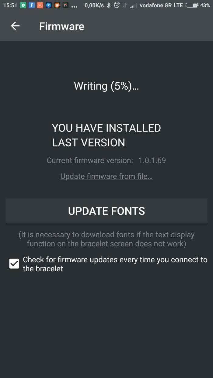 Τελικά το mi band συνδέθηκε… Τώρα είναι με firmware 1.0.1.69 και το mi fit 3.3.0 stable χωρις το ελληνικό firm, αλλά δεν υπάρχει η δυνατότητα για μείωση της χρονοκαθυστερησης των κλήσεων στο mi band σε λιγότερο των 3 δευτερολέπτων…