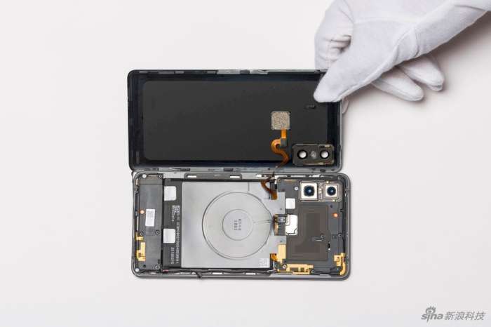 Κατά την αφαίρεση του κεραμικού καλύμματος της μπαταρίας, πρέπει να προσέχετε να το ανοίξετε αργά από τη μία πλευρά για να αποφύγετε το σχίσιμο του καλωδίου για τα δακτυλικά αποτυπώματα. Αφού ανοίξει η πλάτη, το ασύρματο πηνίο φόρτισης βρίσκεται στο προσκήνιο. Πάνω από το ασύρματο πηνίο φόρτισης υπάρχει μια κεραία NFC.