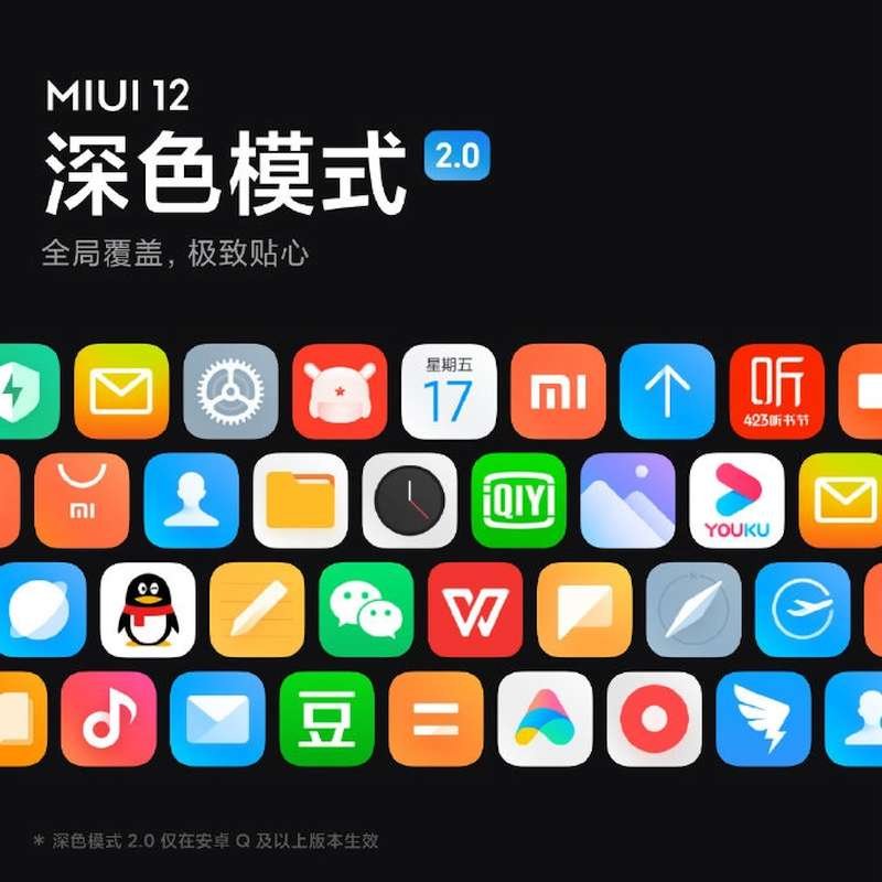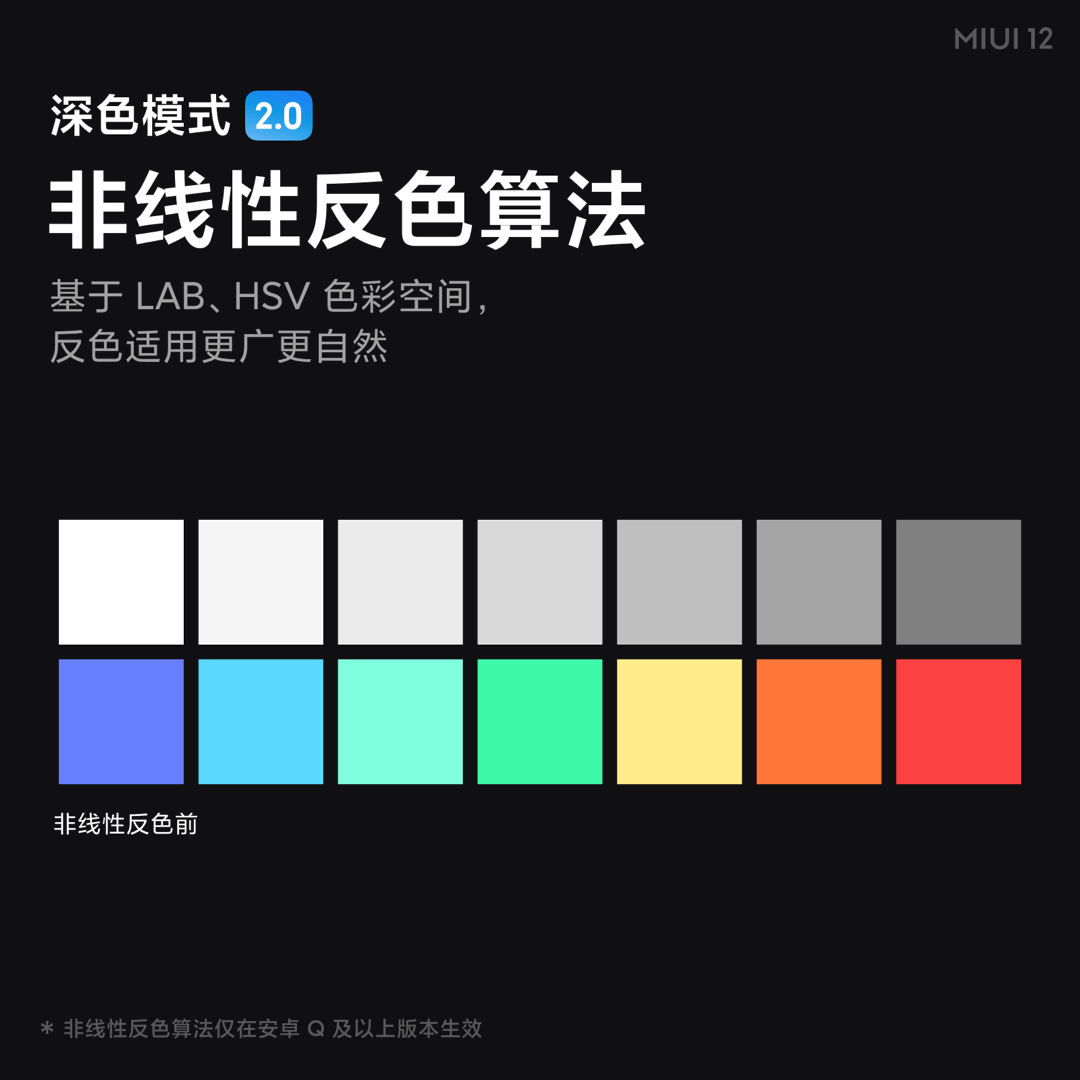 Σύμφωνα με την Xiaomi, το Dark Mode 2.0 θα έχει τρία χαρακτηριστικά: 1. Παγκόσμια κάλυψη: 42 εφαρμογές συστήματος προσαρμόζονται σε βάθος, 20 εφαρμογές mainstream είναι βαθιά προσαρμοσμένες για το MIUI και ένας μεγάλος αριθμός εφαρμογών τρίτων κατασκευαστών υποστηρίζει τώρα αλγόριθμους μη γραμμικής αντιστροφής. 2. Ισχυρός μη γραμμικός αλγόριθμος αντίστροφου χρώματος, που προσδιορίζει με ακρίβεια τα στοιχεία του interface και αναστρέφει δυναμικά τα χρώματα για κάθε αντικείμενο διεπαφής. 3. Ο αντίστροφος αλγόριθμος χρώματος βασίζεται στο χώρο χρωμάτων Lab και HSV και η αντίστροφη προσαρμογή χρώματος είναι ευρύτερη και πιο φυσική.